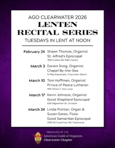 Featuring COGS Music Director & Organist, Tom Huffman Playing at Prince of Peace Lutheran, 455 Missouri Ave N., Largo FL.