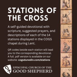 The Stations of the Cross, also called the Way of the Cross, is a traditional liturgical service commemorating the last day of Jesus’ life. In the Episcopal Church, this Service is usually conducted during Holy Week or on Good Friday.